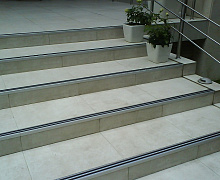 Способ монтажа: алюминиевый порожек без вставки крепится на ступени при помощи саморезов (идут в комплекте). Затем прорезиненную ПВХ вставку нужно нагреть строительным или обычным феном, либо подержать в горячей воде, чтобы материал стал мягче и легче вошел в паз профиля.